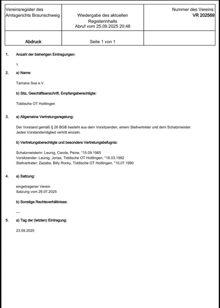 Wir sind beim Amtsgericht Braunschweig im Vereinsregister unter der Nummer VR202569 offiziell registriert.