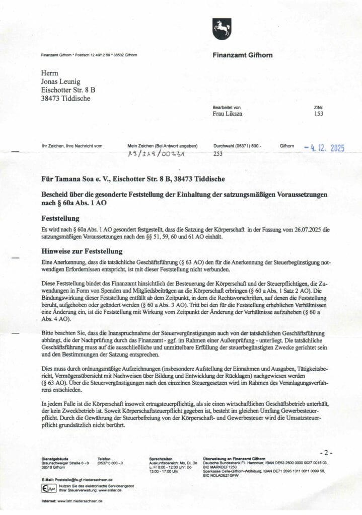 Unsere Gemeinnützigkeit ist durch das Finanzamt Gifhorn bestätigt.